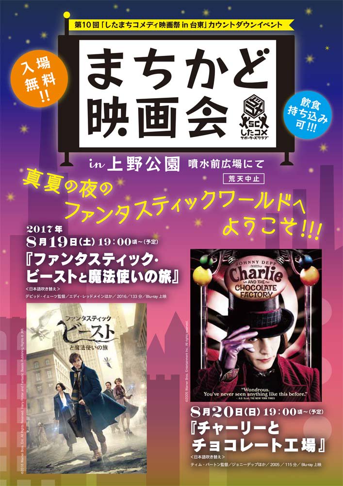 東京都 台東区 イベント 第10回 したまちコメディ映画祭in台東 カウントダウンイベント まちかど映画会in上野公園 を開催 8月19日 土 は19時頃から上野公園噴水前広場で ファンタスティック ビーストと魔法使いの旅 を上映 入場無料です